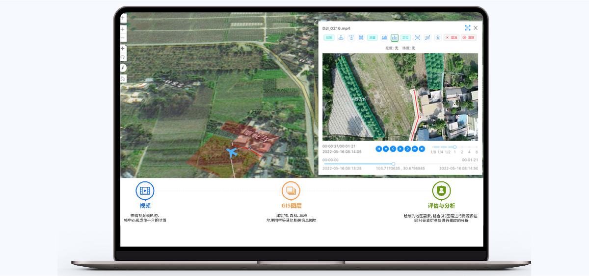作业人员在收集FMV数据后立即对其进行实时分析或取证分析。例如,在自然灾害后进行损失评估,则可以使用FMV技术分析从无人机收集的最新视频数据以及现有的GIS数据层。由于视频轨迹在地图上可见,因此可以准确了解视频中可见的建筑物和基础设施,还可以评估其状况、在视频和地图中标记地面要素、为其位置添加书签以及在说明中对其进行描述。