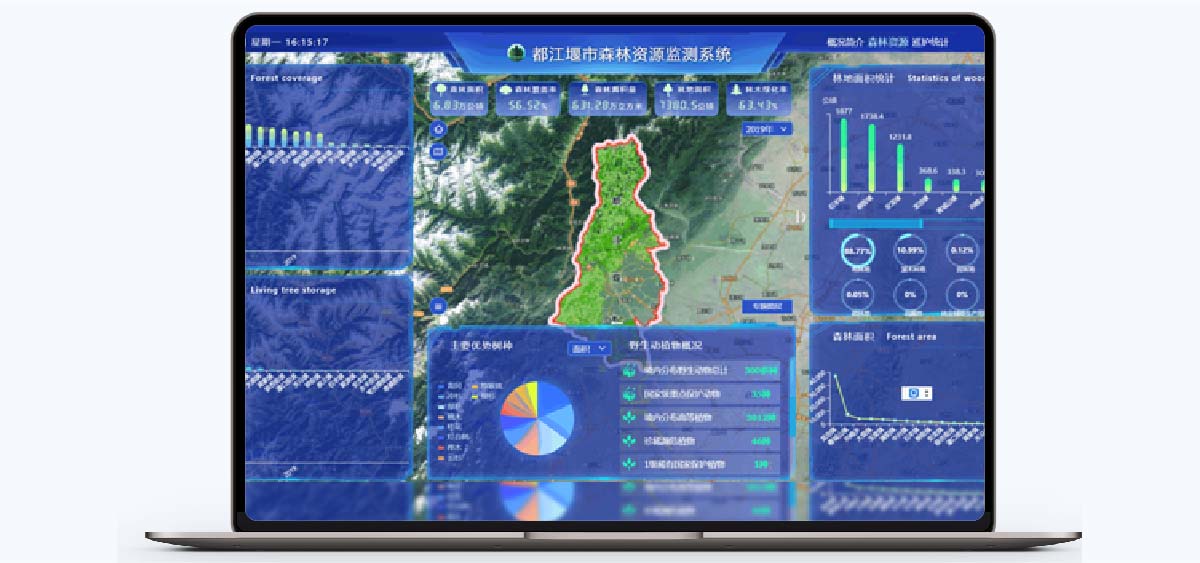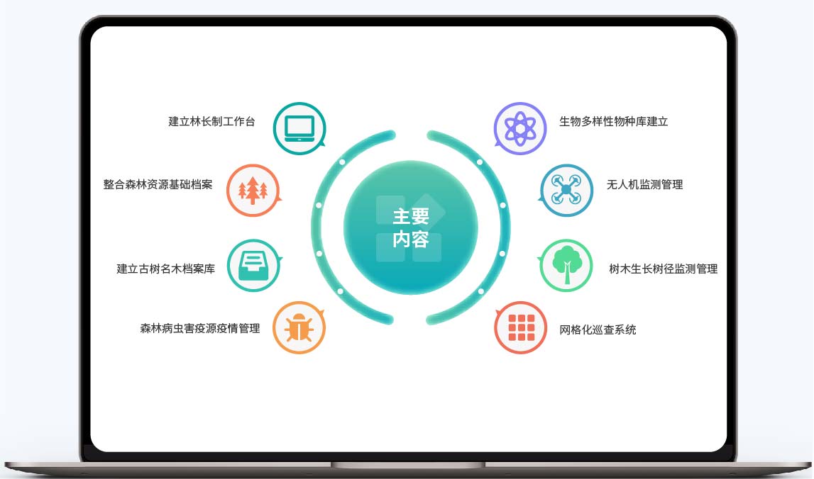 整合森林资源基础数据,依据林长制考核评价的成效考核指标、监督指标、奖惩指标,包括森林面积、森林覆盖率、森林蓄积、建成区绿化覆盖率、湿地保护率、野生动植物保护、森林防灭火、林业有害生物防控、林业案件查处、林业总产值、林农增收等数据,运用物联网、大数据等先进互联网技术,通过内外业结合,对森林资源现状、成长状况等做科学监测和成长测算,从技术层面为林长制各项工作提供科学依据和建议。